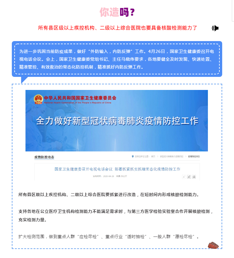 所有縣區(qū)級(jí)以上疾控機(jī)構(gòu)、二級(jí)以上綜合醫(yī)院要抓緊進(jìn)行改造,在短時(shí)間內(nèi)形成核酸檢測(cè)能力。