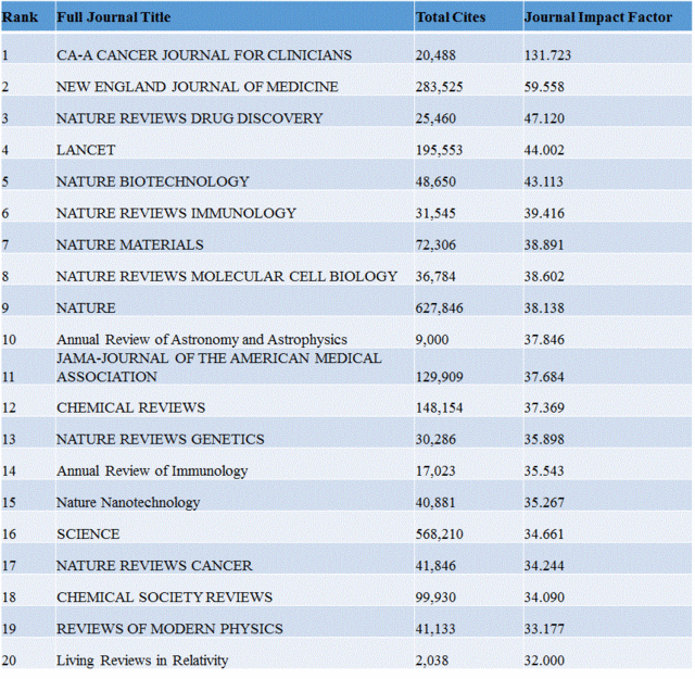 2016年6月14日訊-- 北京時間6月14日,湯森路透《SCI期刊分析報告》(Journal Citation Reports)新鮮出爐。第一第二依然是CA-Cancer J Clin和NEJM,NATURE REVIEWS DRUG DISCOVERY此次排名上升為第三。第4-7位分別為Lancet,NATURE BIOTECHNOLOGY,NATURE REVIEWS IMMUNOLOGY,NATURE MATERIALS