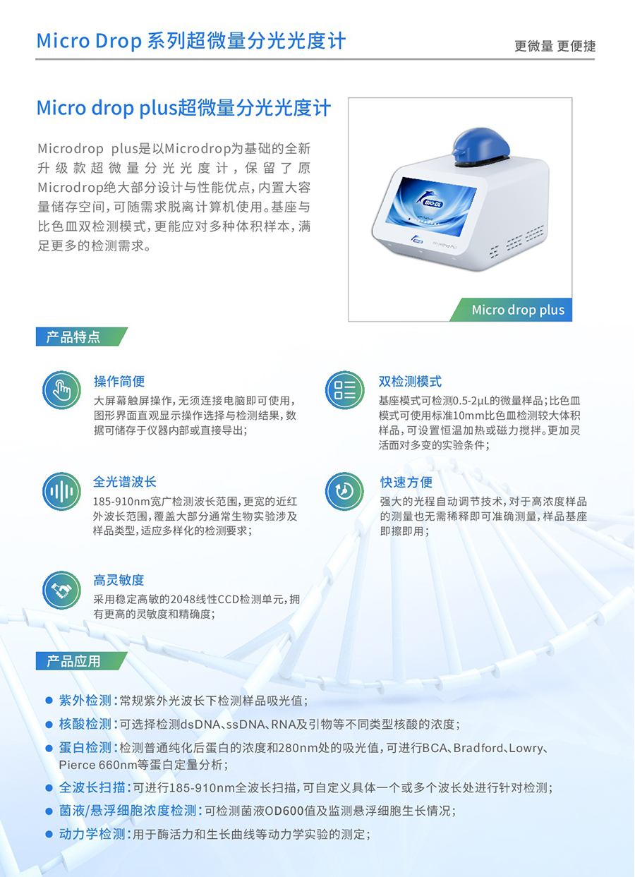 Microdrop plus超微量分光光度計是寶予德Microdrop的升級款,體積小巧,方便放置于各種空間能快速準確地檢測微量(0.5-2uL)樣品中目標物質(zhì)的吸光值,波長掃描范圍廣,通過其寬闊的觸摸屏可以輕松簡單地進行操作。它具有多種檢測模式,能夠輕松應對不同檢測實驗室中對樣本中DNA/RNA/蛋白質(zhì)等生物分子物質(zhì)的吸光度檢測。