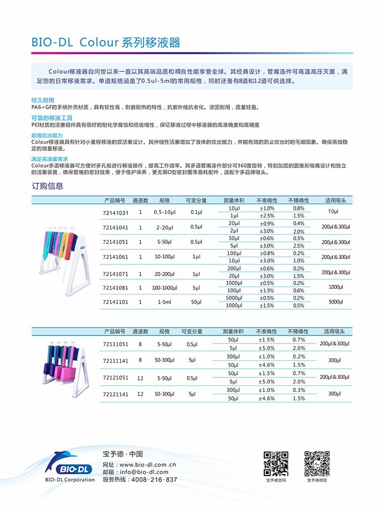 Colour彩色移液器是更具性價比的經久耐用的移液器,其下涵蓋單道微量可調移液器0.5-1000μl,單道可調大體積移液器1-5ml和多道微量可調移液器5-300μl。